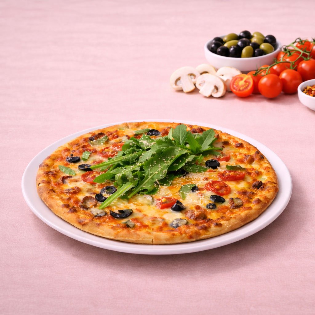 Mozzarella peyniri, pizza sosu, siyah zeytin, cherry domates, kültür mantarı, köy biberi, istiridye mantarı, ezine beyaz peyniri, roka ve parmesan peyniri ile.