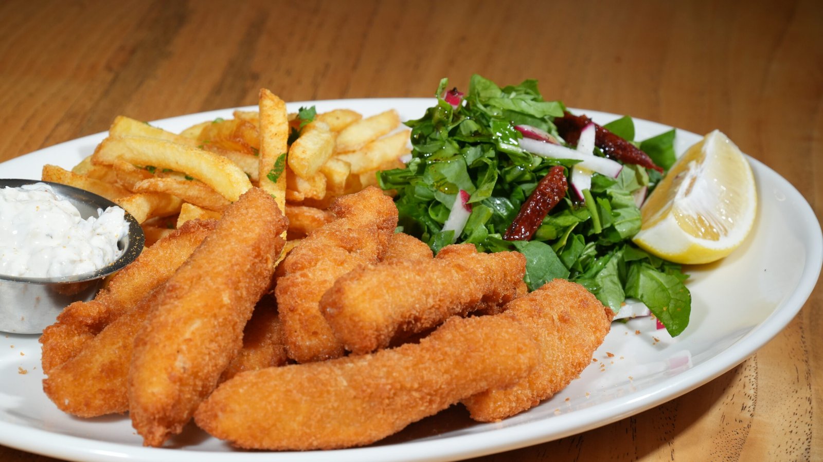 Çıtır Levrek Parçaları, Roka , Limon,Üzerine Sriracha Mayonez Sos ,Patates Kızartması ,Tartar Sos Eşliğinde,