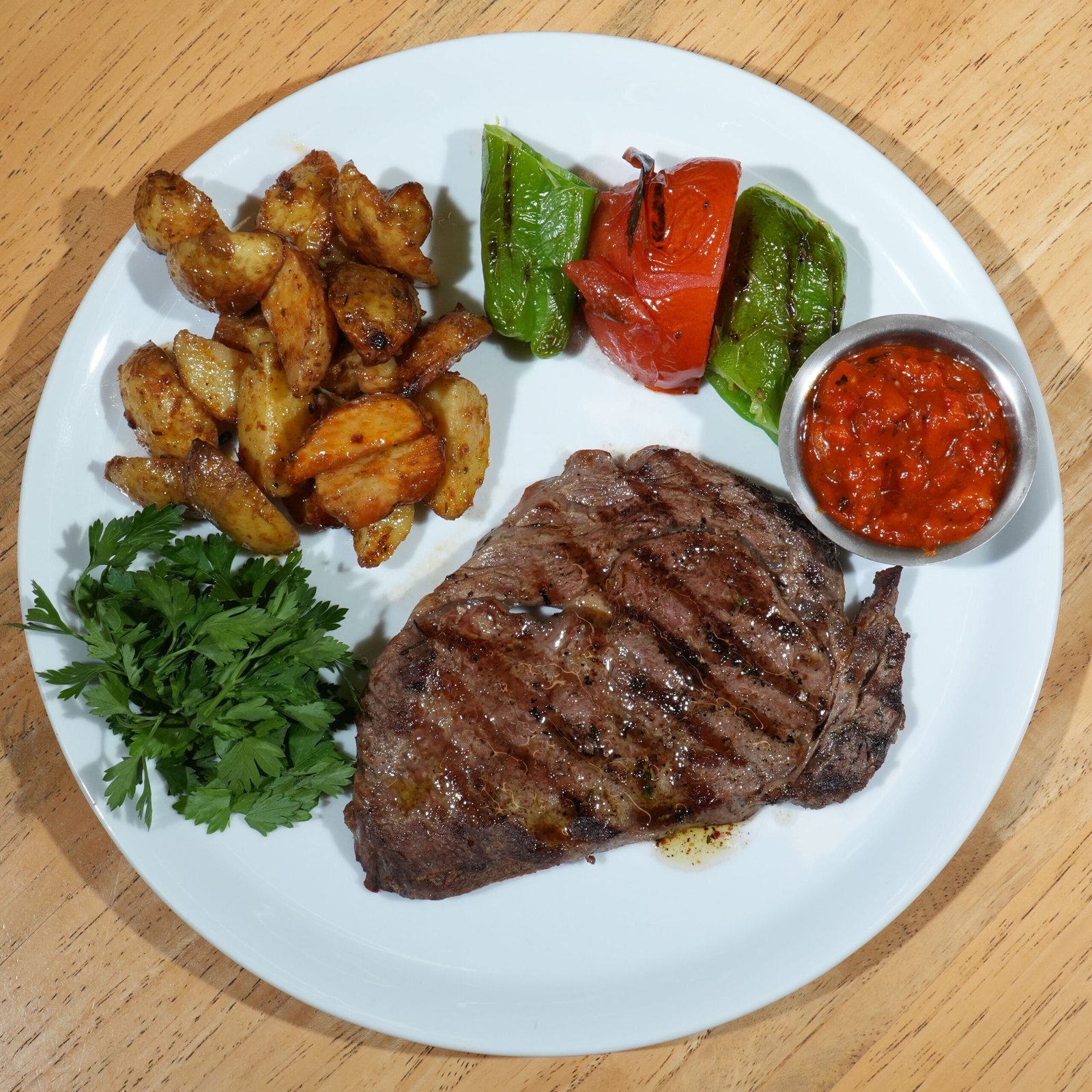200 Gr dana antrikot, ızgara domates, köy biberi, roka, acuka ve fırın patates eşliğinde.
