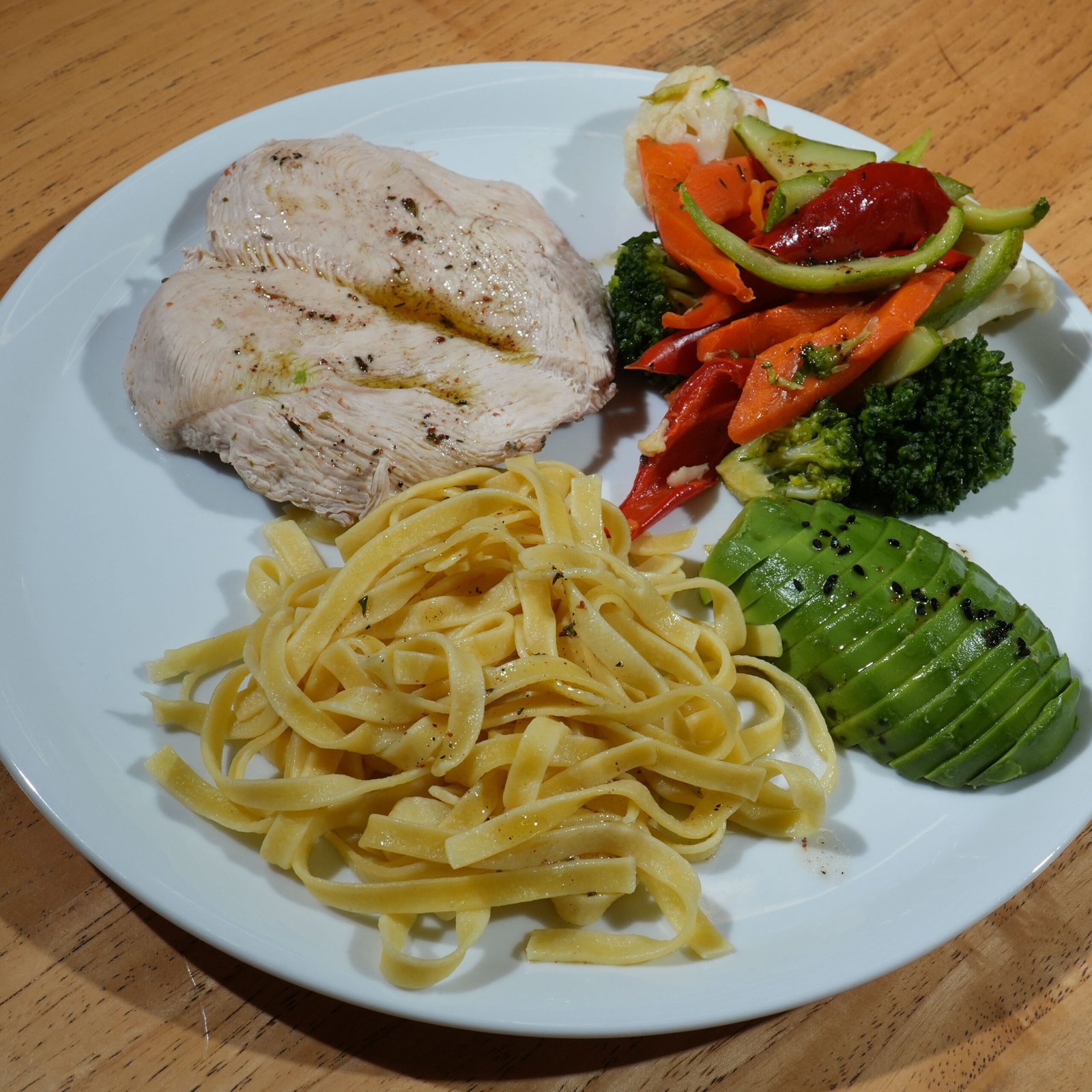 200 Gr buharda tavuk göğsü, sade makarna, haşlanmış mevsim sebzeleri ve avokado eşliğinde.