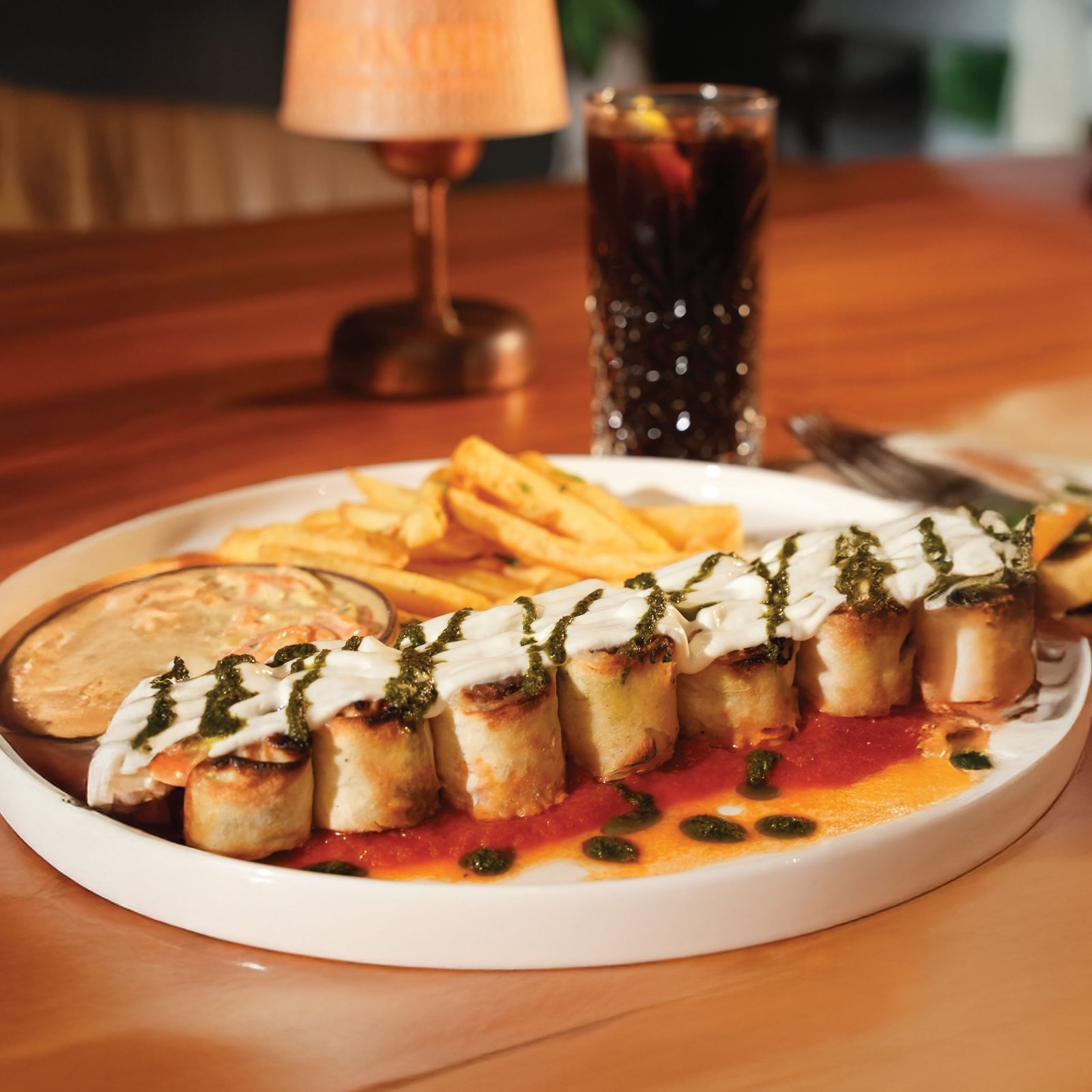Yufka ekmeğine sarılmış 200 gr satır kıyması köfte, hellim peyniri, özel yoğurt sosu, pesto sos, coleslaw salata ve patates kızartması eşliğinde.