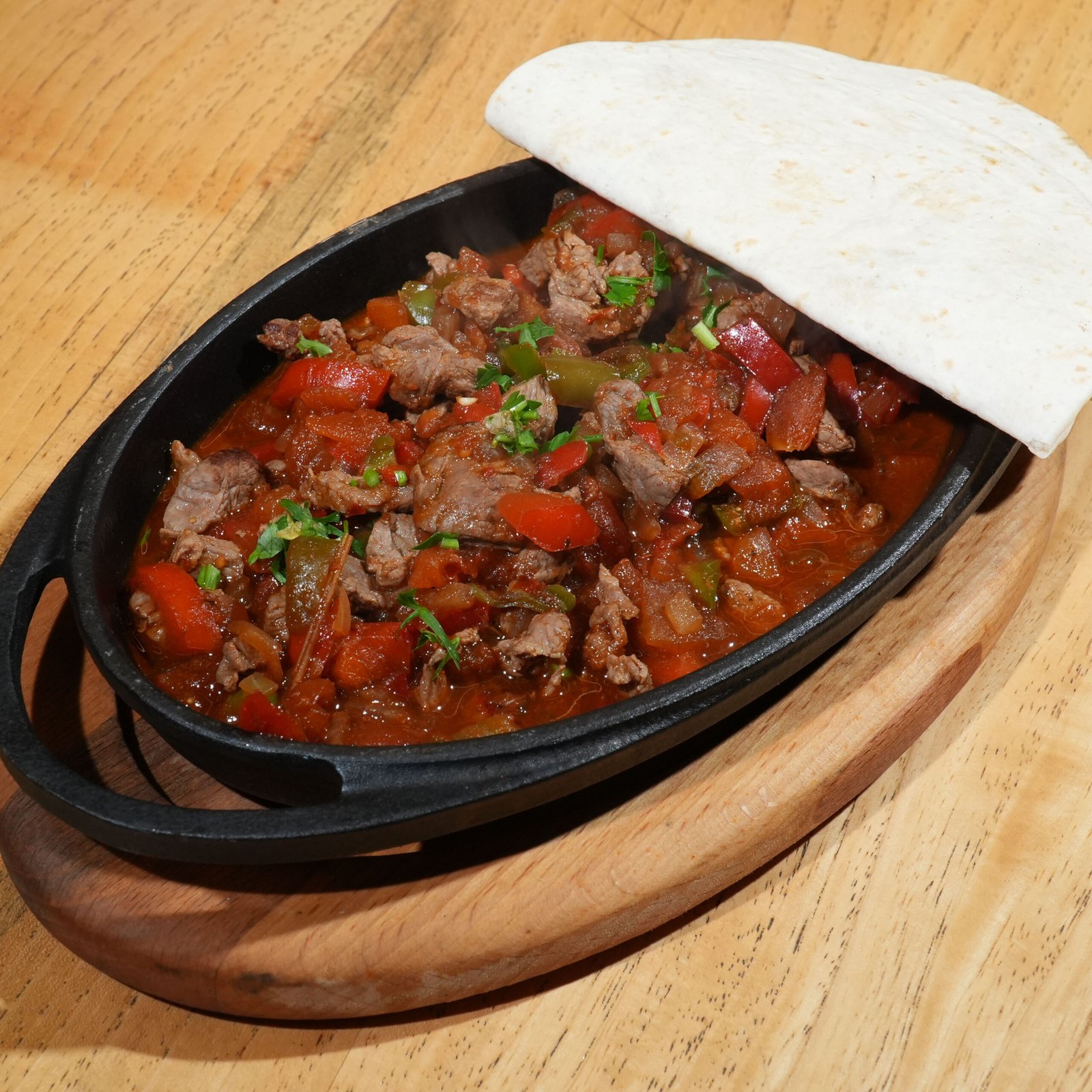 130 Gr jülyen dana bonfile, renkli biberler, kuru soğan, domates ve tortilla ekmeği eşliğinde.