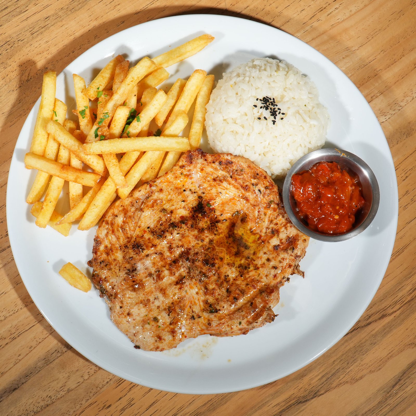 200 Gr tavuk bonfile, pirinç pilavı, acuka ve patates kızartması eşliğinde.