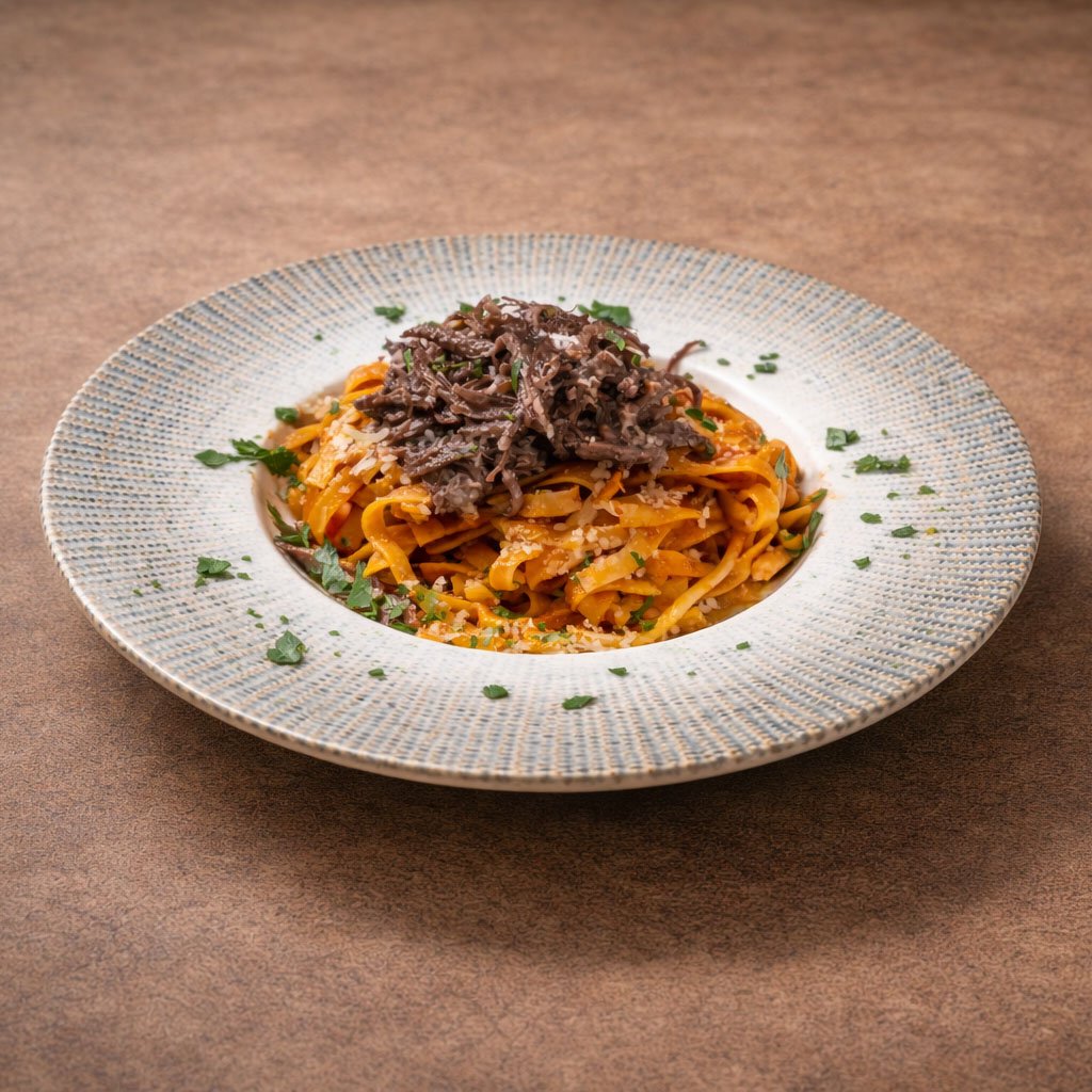 70 Gr tiftik kaburga eti, domates sos, sarımsak, şefin özel sosu ve parmesan peyniri eşliğinde.