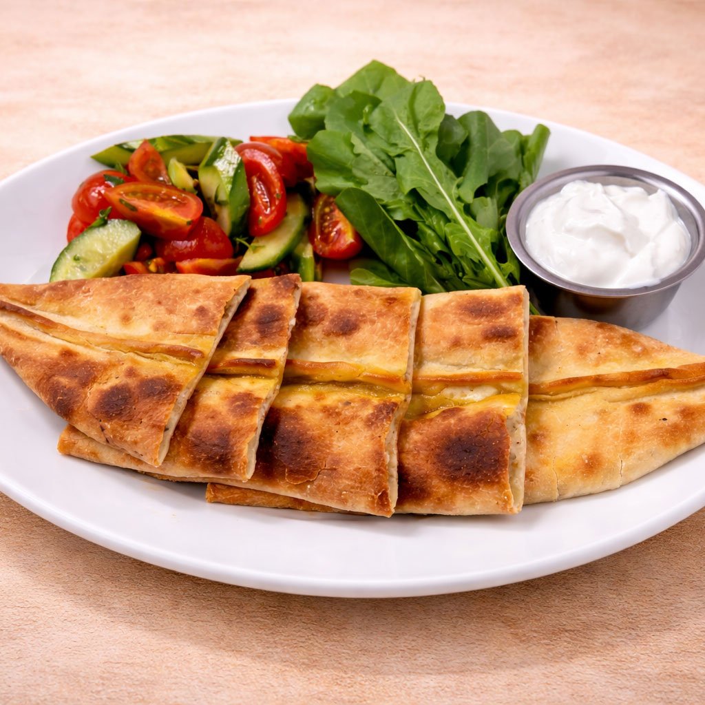 Özel baharatlarla harmanlanmış dana kıyma harcıyla hazırlanan kapalı çıtır pide, rende mozarella, domates & salatalık, roka ve süzme yoğurt eşliğinde.
