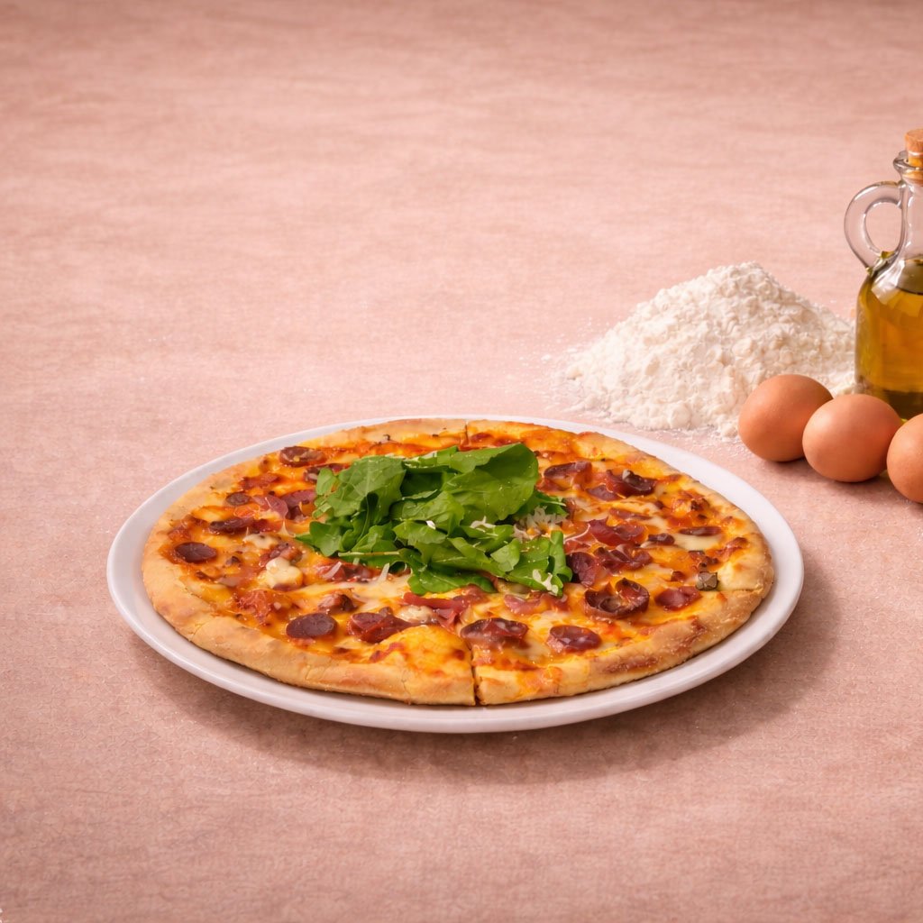 Dana sosis, dana sucuk, dana jambon, mozzarella peyniri, pizza sosu, roka ve parmesan peyniri ile.